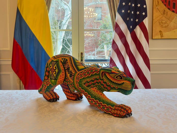 Petro presented Trump with a series of gifts: a wooden jaguar carved by an indigenous artist, a dress made by a Colombian designer for first lady Melania Trump, and a handmade aboriginal basket filled with chocolate and coffee grown by small farmers from former coca growing regions.