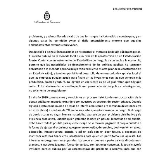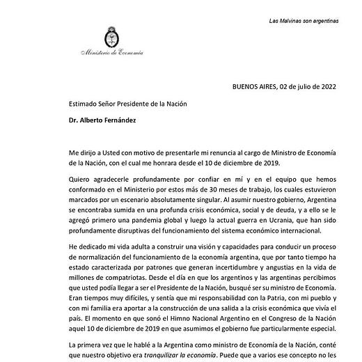 El sábado, el ministro de Economía de Argentina, Martín Guzmán, renunció de forma dramática. En una carta de siete páginas, describió lo que considera sus logros económicos. Entre ellos, los subsidios al salario privado de la época de la pandemia y el pago del Ingreso Familiar de Emergencia (IFE), seguidos de los descensos del desempleo y la pobreza tras la cuarentena. Pero, sobre todo, incluyó el acuerdo de este mes de marzo con el Fondo Monetario Internacional (FMI), que refinancia una montaña insostenible de deuda heredada del gobierno anterior.